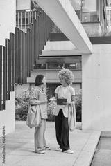 Full length shot of diverse women meet together to discuss startup project hold tablet and spiral notebook dressed in stylish clothes carry bags pose near urban building outdoors. Meeting of students