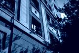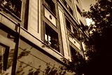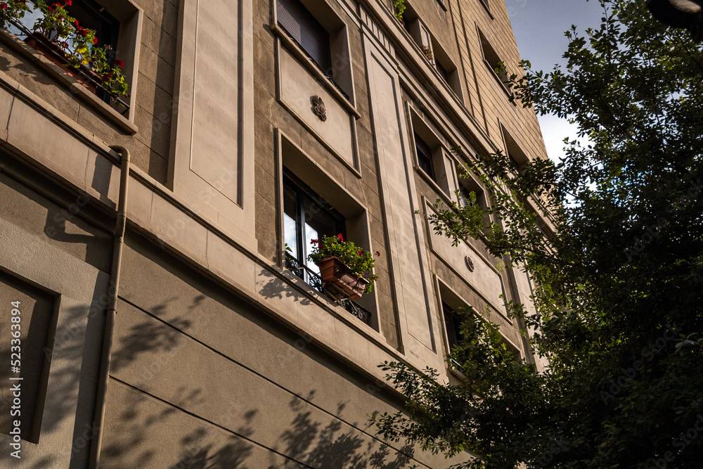Building with windows and evening sun light and shadows. Sunset in the city Barcelona, Spain