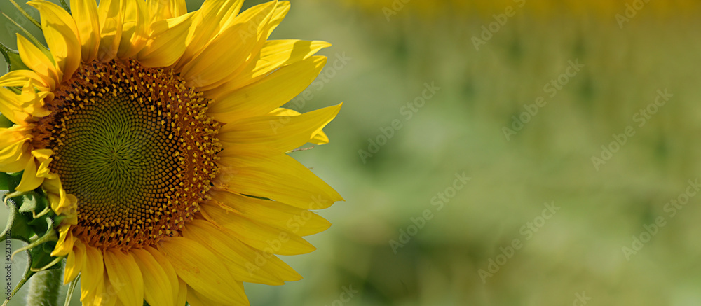 yellow sunflower flower on green background. summer banner. copy space. concept of farm, summer, agriculture, abundance, health, sun