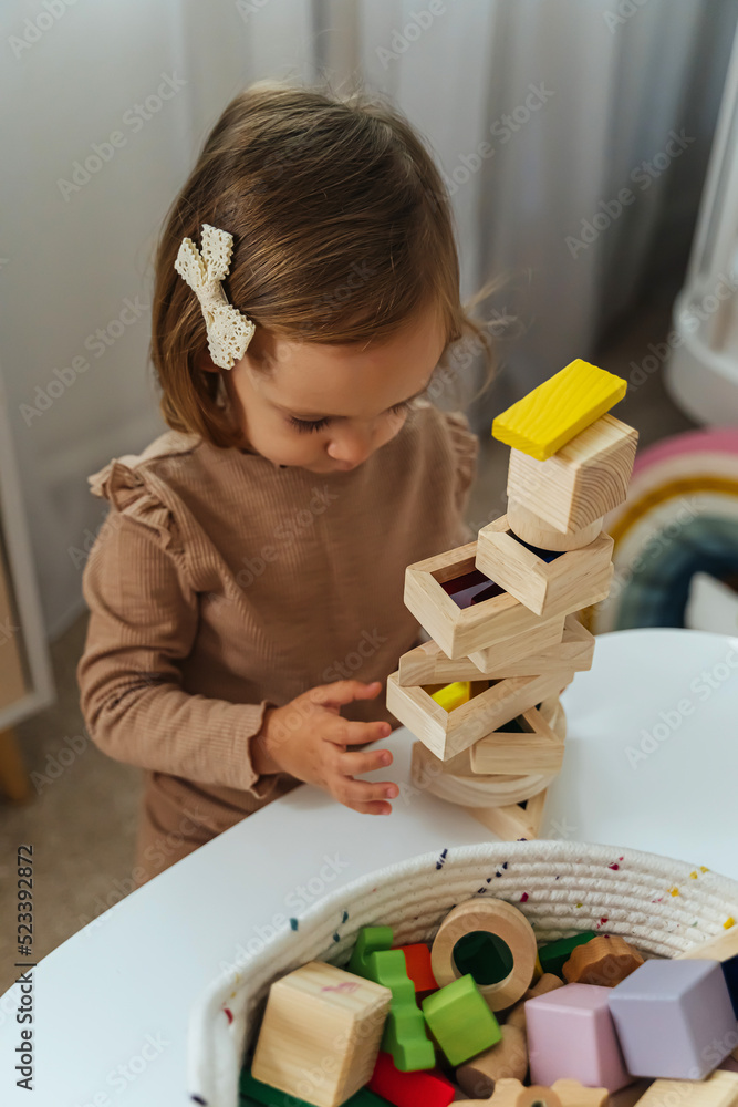 A little girl playing with wooden blocks on the table in playroom. Educational game for baby and toddler in modern nursery. The kid builds a tower from wooden rainbow stacking blocks.