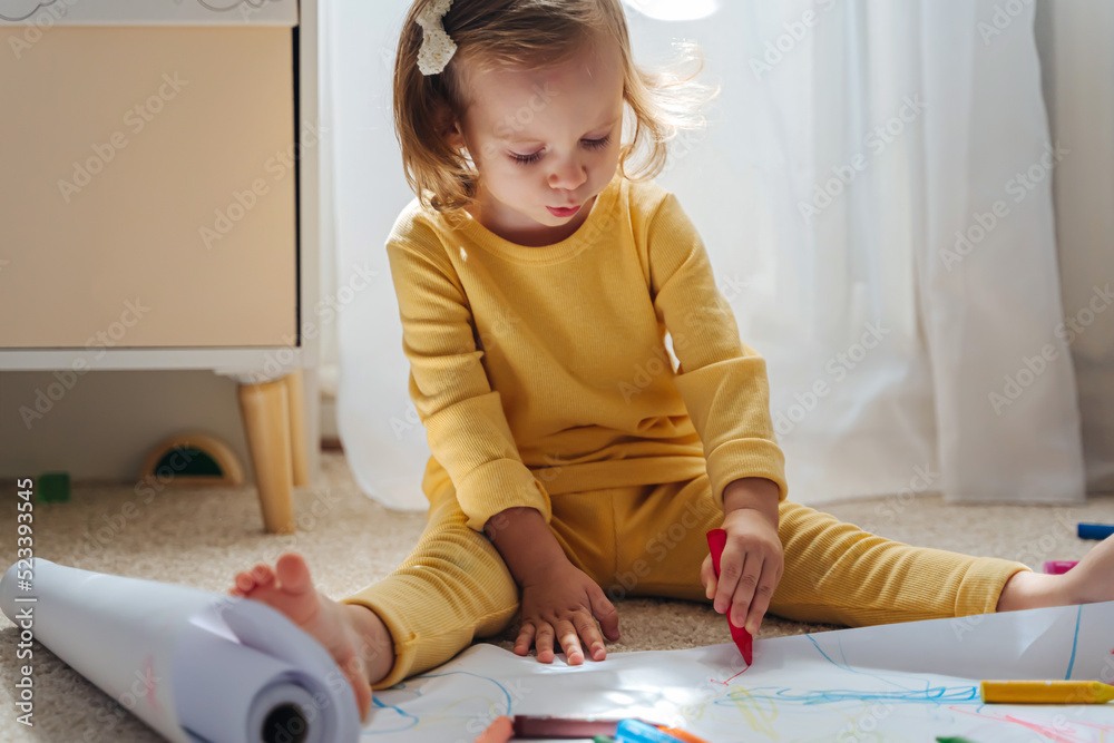 A little girl drawing on floor on paper in the kids room. Educational game for baby and toddler in modern nursery. Early development.