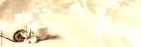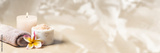 Beauty Spa salon banner. Burning candle, towel with frangipani flower and salt scrub on beige background with tropical leafe texture.