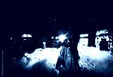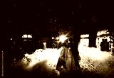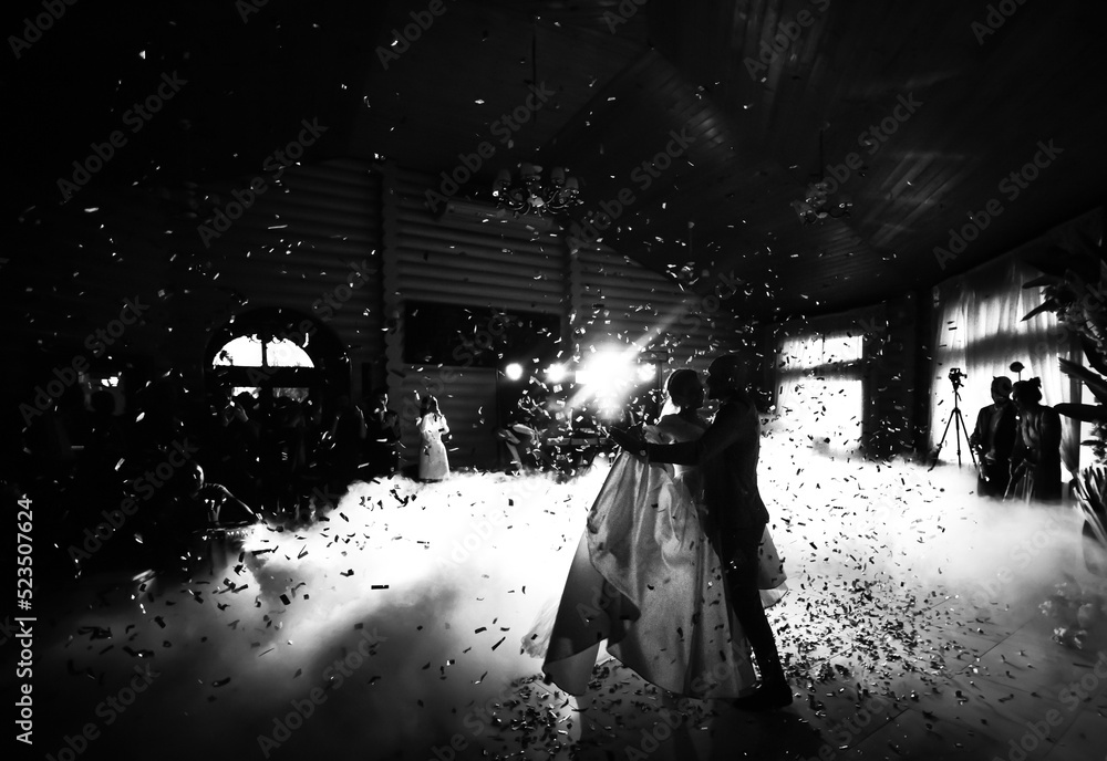 Black and white photo of the first dance of newlyweds with lighting effects and confetti, silhouettes