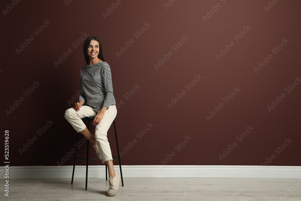Beautiful young woman sitting on stool near brown wall. Space for text