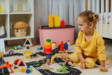 A little girl sitting on floor plays with toy wooden blocks cars and road in playroom. Educational game for baby and toddler in modern nursery.