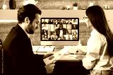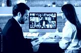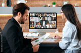 Business collaboration, caucasian man and woman, sit in a modern office in front of a computer screen, have an online video meeting with multiracial colleagues, smiling. Brainstorm of business group