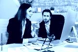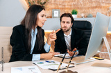 Cooperation concept. Two successful caucasian employees, business partners, sit at a table in the office, look at computer screen, study the company's financial prospects and risks with concentration