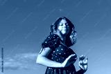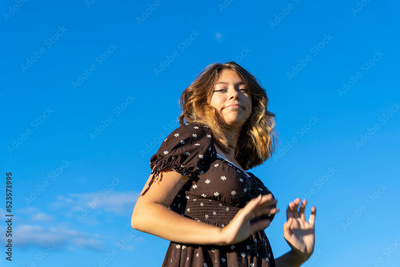 attractive girl with long hair in fashionable brown dress against sky