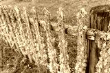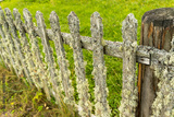 old wooden rural fence made of picket fence overgrown with moss
