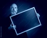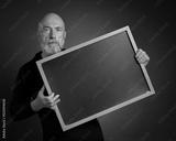 senior man, teacher, mentor or presenter, with blank blackboard, education, presentation and business communication concept
