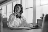 Attractive european business woman working laptop while sitting in cozy cafe. Blurred background