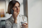 European business woman holding cup of coffee and talking phone while standing near window at office