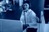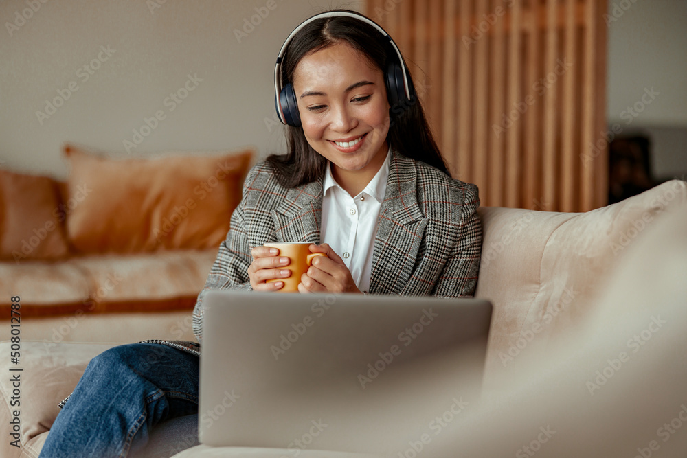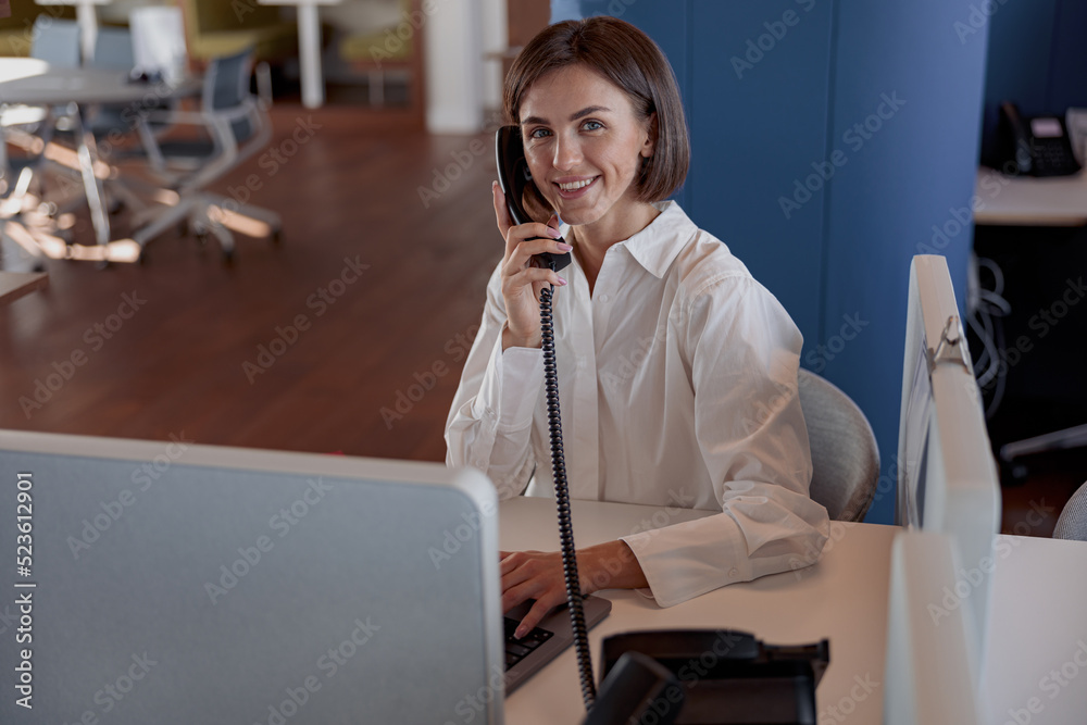 Smiling woman worker talk phone with client sit on her workplace in office. Blurred background