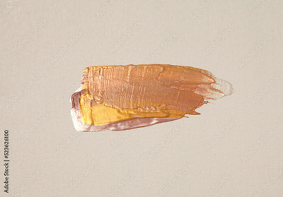 Abstract gold acrylic smear brushstroke blot painting on canvas wall. Beige color copy space texture horizontal background..