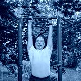 senior male exercising (bar hanging and pull-outs) on outdoor fitness tower in a backyard, summer in Colorado