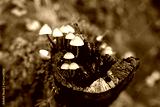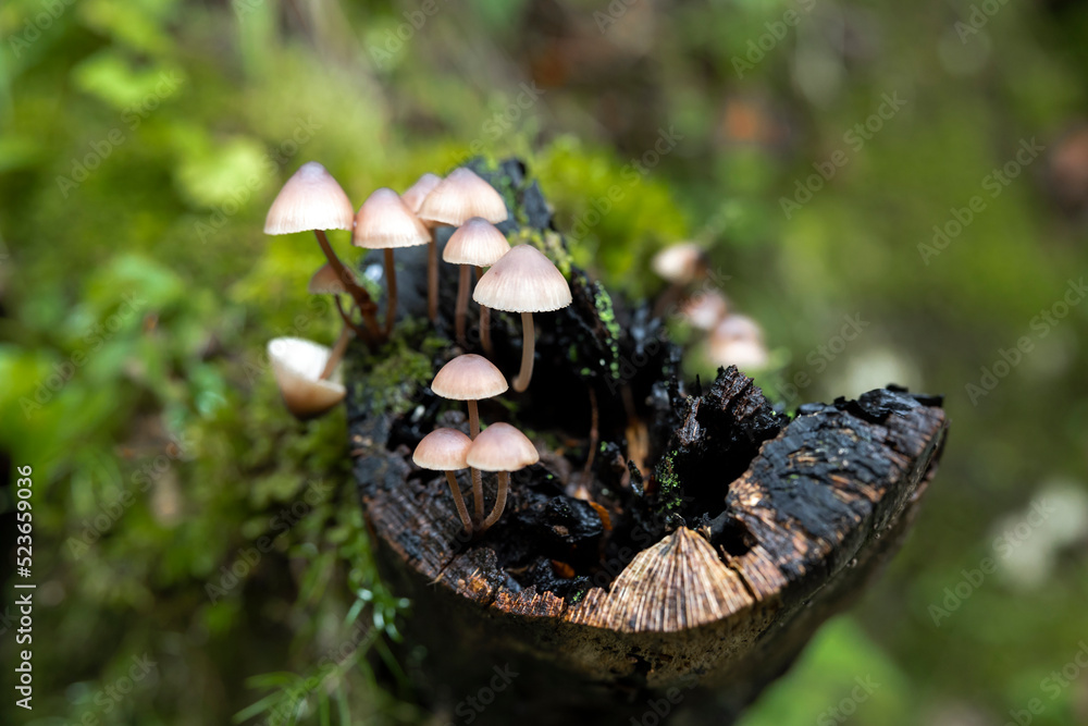 Forest Mushrooms on a Tree Stump Close Up