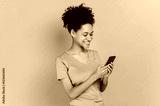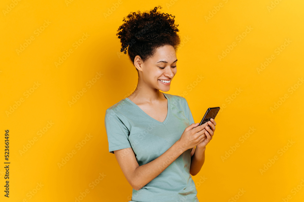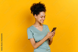 Satisfied glad african american young woman with curly hair, using her smartphone, looking at the screen, browsing the internet, chatting with friends, standing on isolated orange background, smiling