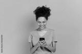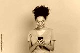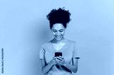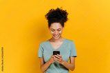 Wireless technology, gadget. Excited positive african american curly young woman uses smartphone, browsing internet, messaging with friends online, stand on isolated orange background, looks at screen
