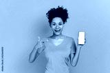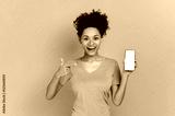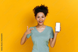 Amazed shocked african american curly young woman, surprised looks at the camera, holds cell phone with a blank white screen and points finger at it, stand on isolated orange background. Mock-up