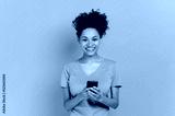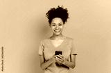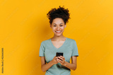 Lovely positive african american curly young woman uses smartphone, browsing internet, messaging with friends in social networks, stand on isolated orange background, looks at camera, smile