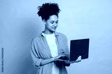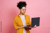 Positive lovely african american modern young curly haired woman, holding an open laptop in hand, looks at the screen, standing against isolated pink background, smiling happily. Wireless technology
