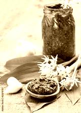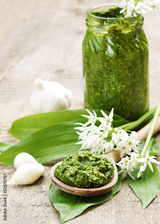 Bärlauch-Pesto mit Bärlauchblättern und Bärlauchblüten, Textraum, Copy space, Hochformat