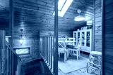 Stairs and dining room with table and chairs on the second floor of completely wooden house.