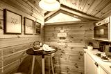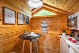Compact kitchen with small round dining table in wooden house. Village life concept.