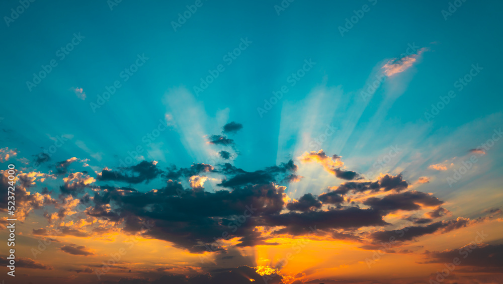 Sunset with grey clouds and light beams