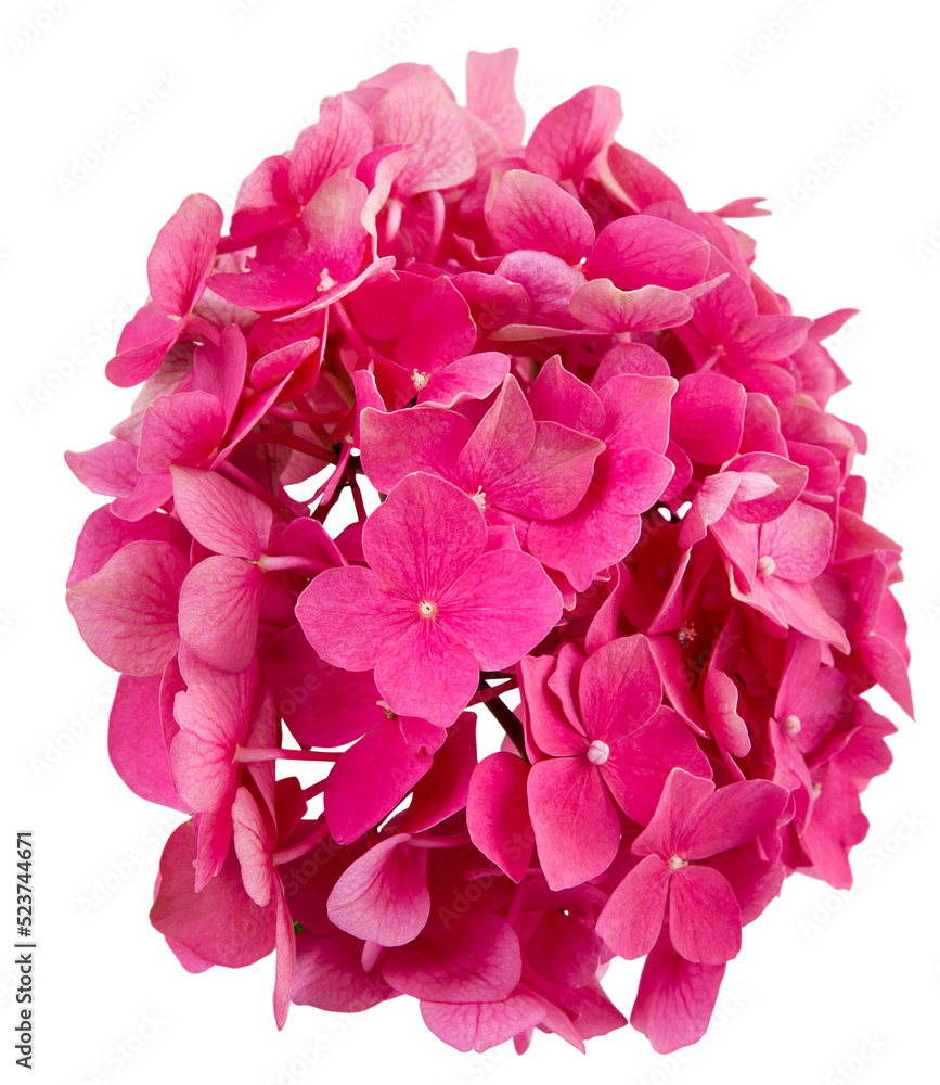 inflorescence of pink hydrangea isolated on transparent background with white