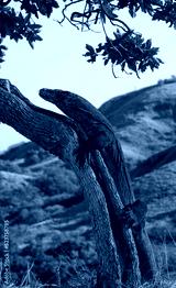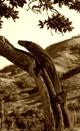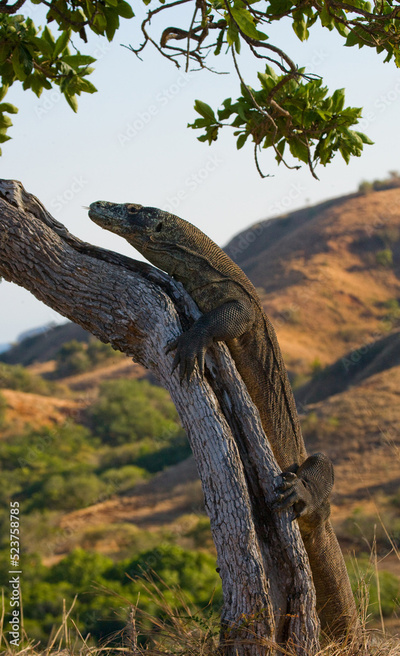 Komodo dragon is climbing up a tree. Indonesia. Komodo National Park.