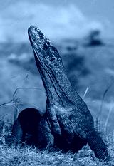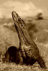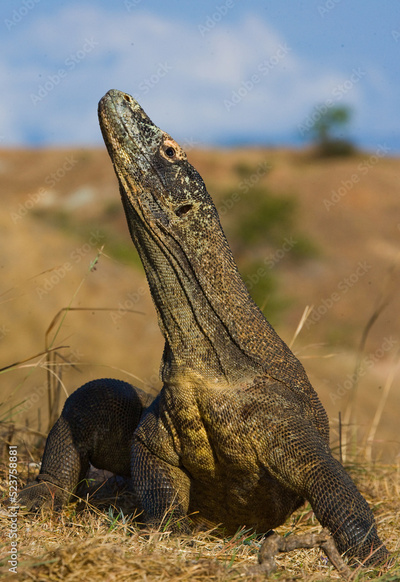 Komodo dragon is sitting on the ground against the backdrop of stunning scenery. Indonesia. Komodo National Park.