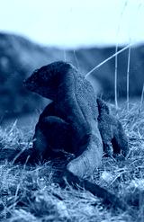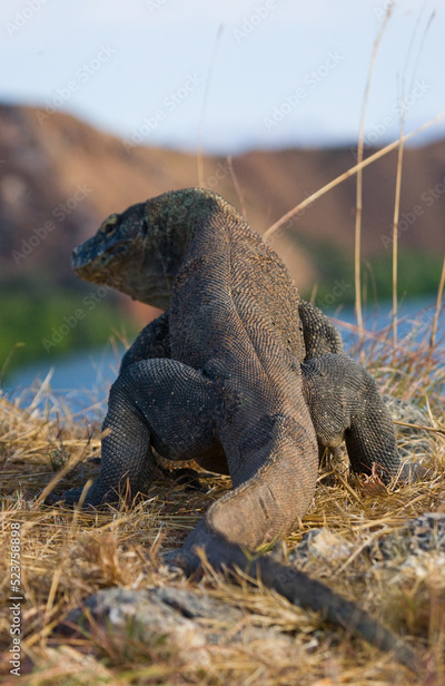 Komodo dragon is sitting on the ground against the backdrop of stunning scenery. Indonesia. Komodo National Park.