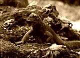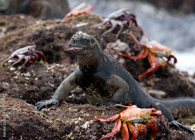 Marine iguana (Amblyrhynchus cristatus) is sitting on a rock surrounded by red crabs. Galapagos Islands. Pacific Ocean. Ecuador.