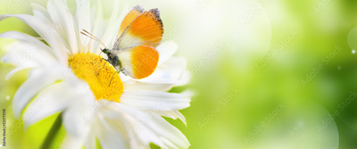 Daisy flower and butterfly on green spring background