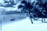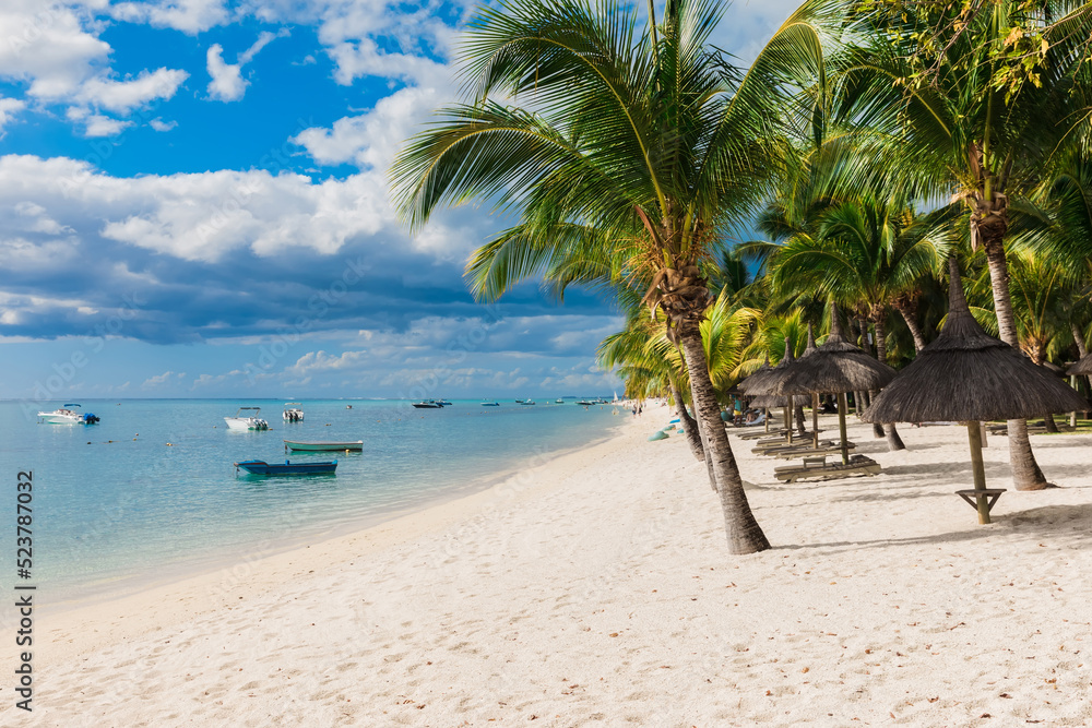 Beautiful view of tropical beach in Mauritius. Transparent ocean, beach, coconut palms and blue sky