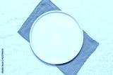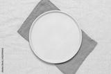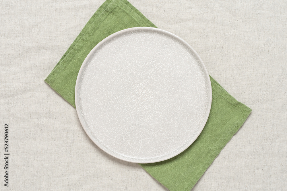 Empty beige plate as mockup with green napkin. Beige linen textile background. Top view, flat lay.