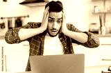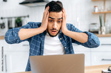 Close-up of shocked confused mixed race young man, freelancer or employee, looking surprised at laptop screen, stressed from the failure of a deal or project, read unexpected news, in desperation