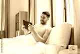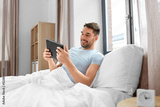technology, internet and people concept - man with tablet pc computer in bed at home bedroom