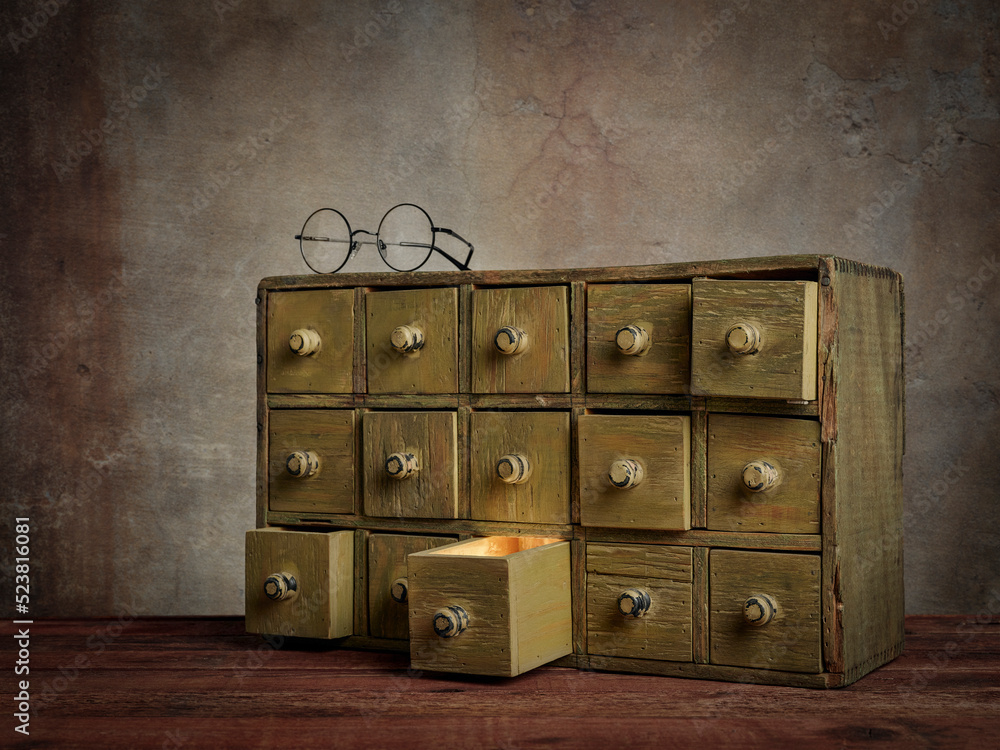 primitive wooden apothecary or catalog cabinet with light coming from the opened drawer - storage and sorting concept