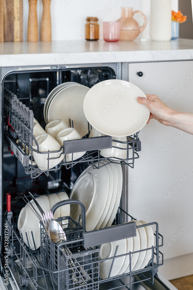Person's hand picking up clean dishes from dishwasher