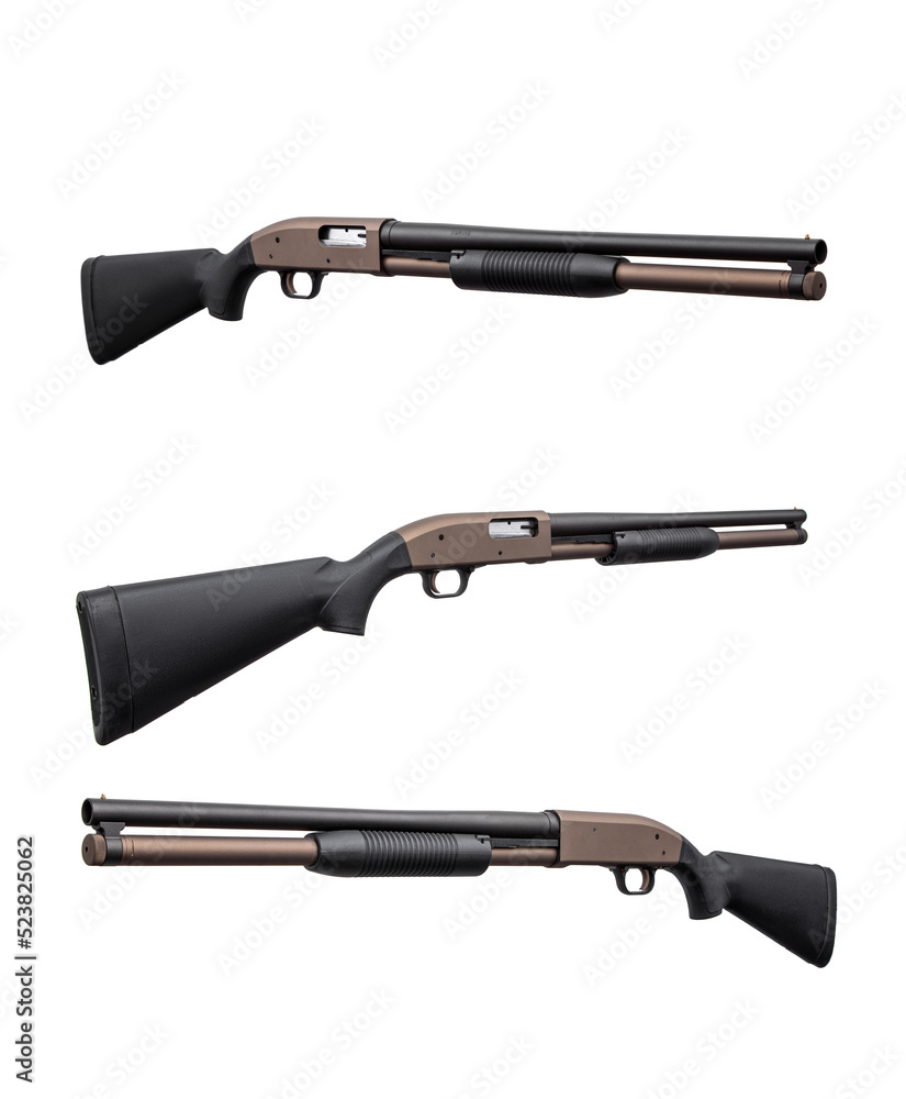 Pump-action 12 gauge shotgun isolated on a white back. A smooth-bore weapon with a plastic stock.