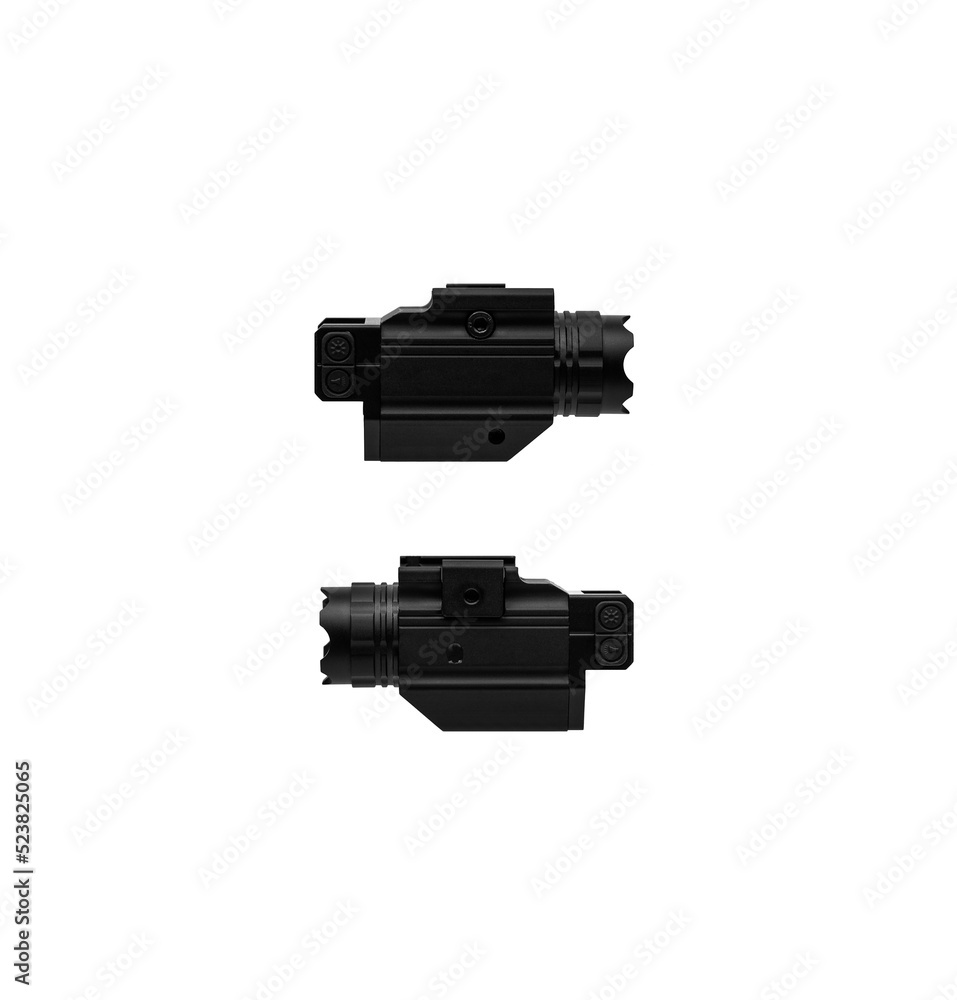 Modern LED flashlight with weapon mount. Underbarrel tactical flashlight isolate on white back.