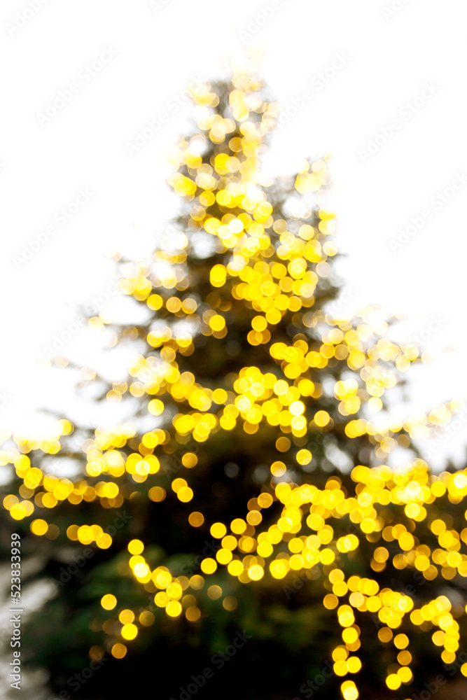 Seasonal Christmas decoration background. Outdoor Christmas Lights bokeh, blurred defocused view. Xmas golden lights glowing against twilight sky. Vertical image.