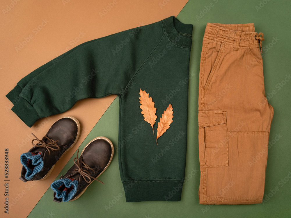 Composition of toddler boy warm clothes and shoes on a color background. Children's clothes for autumn. Kids fashion outfit. Winter, autumn collection. Organic cotton. Top view, flat lay.