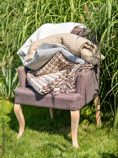 Classic armchair with stack of plaids on sunny terrace. It is time to warm up with comfortable wool plaid. Preparing for chilling autumn evenings at the backyard.