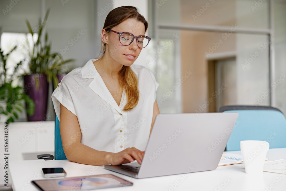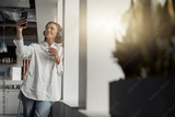European business woman holding cup of coffee and using phone while standing near window at office