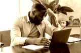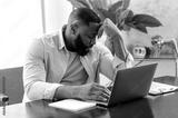 Sad exhausted african american young man, company employee, sitting at a desk, looks tired and stressed, experience headache, migraine, needs rest, closed his eyes. Overworked from work, deadline