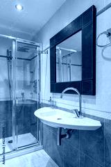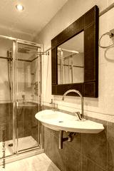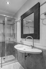 Interior of a new luxury bathroom with a mirror in a leather frame.