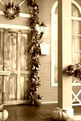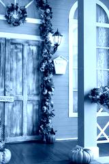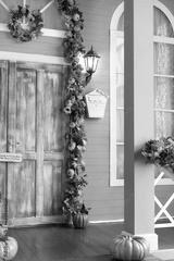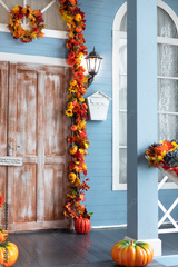 Residential house decorated for Halloween holiday. Different colored pumpkins in front door On Wooden Steps. Porch of yard decorated with orange pumpkins in autumn. Thanksgiving. Halloween outside.